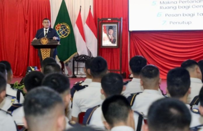 SABANA KABA, D.I. Yogyakarta—Wakil Menteri Agraria dan Tata Ruang/Wakil Kepala Badan Pertanahan Nasional (Wamen ATR/Waka BPN), Ossy Dermawan, memberikan kuliah umum kepada Taruna/i Sekolah Tinggi Pertanahan Nasional (STPN), di Pendopo STPN, D.I. Yogyakarta, Jumat (09/05/2025). Kepada calon penerus bangsa ini, Wamen Ossy mengingatkan pentingnya pendidikan karakter dalam pembentukan jiwa kepemimpinan.