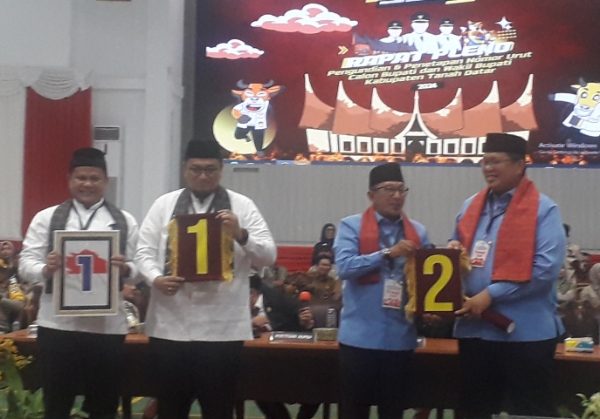 Ketua KPU Tanah Datar. Dicky Andrika didampingi Komisionir KPU Gusriyono, Nini Karlina, Ikhwan Arif dan Tomas Hendriko ketika memimpin Rapat Pleno menyebutkan, proses penetapan No.Urut Paslon ini dapat dilasanakan, setelah sebelumnya dilakukan verifikasi berkas administrasi dan kedua Paslon dinyatakan memenuhi syarat sebagai peserta Pilkada 2024.