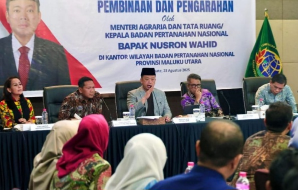 SABANA KABA, Maluku Utara—Menteri Agraria dan Tata Ruang/Kepala Badan Pertanahan Nasional (ATR/BPN), Nusron Wahid, memberikan pembinaan kepada jajaran Kantor Wilayah (Kanwil) BPN Provinsi Maluku Utara, di Kota Ternate, Sabtu (23/08/2025).